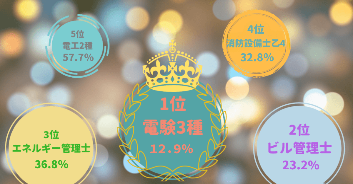 下の図はビルメンで人気な資格の試験合格率で、低い順にランキングされています。このうち、電験3種、エネルギー管理士、ビル管理士が上位資格とされる資格群です。いづれも難関資格ですが、この中でも2番目に合格率が低いのが「ビル管理士」の資格なのです。わずか23.2%しかない国家資格ですので、勉強時間をそれなりに確保しなければなりません。
