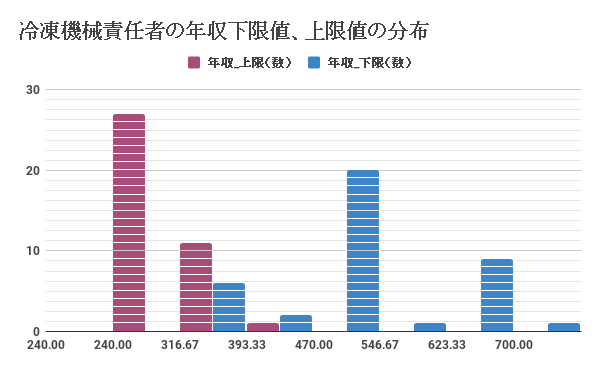 冷凍機械責任者(1種、2種、3種を問わず)を含む求人情報40件から年収の上限値と下限値の分布を調査したものが☝のグラフになります。このグラフを見ると、冷凍機械責任者の年収の下限値は、240~260万円帯の求人が多く、年収の上限値の年収分布では、500~540万円帯の求人が多く分布しているようです。